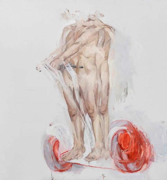 In the exhibition In the Garden of Species at O2art, Si Bowen has displayed more than 10 recent works, among which his treatment of the body was undoubtedly noticeable. In these works, bodies have no heads or limbs, turning themselves as inanimate objects that has been stripped of their specific identities and back to a more "natural" state. For example, in the work Handshake, the two bodies are sitting in a space that looks like a conference room, while the bodies themselves are exposed and distorted by the artist, just like uncivilized animals. All of these make handshaking, an cultured act endowed with meaning, absurd. In Two People While Driving, the man and woman are presented in a parallel relationship in the painting. The latter is like Venus of Urbino, while the former turns his back to the audience. In the blue green scenery in the background and the simple outline of the car, the two people, who are supposed to have an affair, become independent due to lack of narrative hints. This independent individuality is even more obvious in Conflict, which is shown in a more intense way: each of them is left with an intercepted action by the artist, but in two different shadows, the two seem to be facing their respective dilemmas without interfering each other. Behind the discussion on gender issues, the artist put more attention on the discussion of individuals: as a creature with thinking ability, how human beings face, stimulate, judge and understand the objects they confront and how to observe the reflection of themselves.