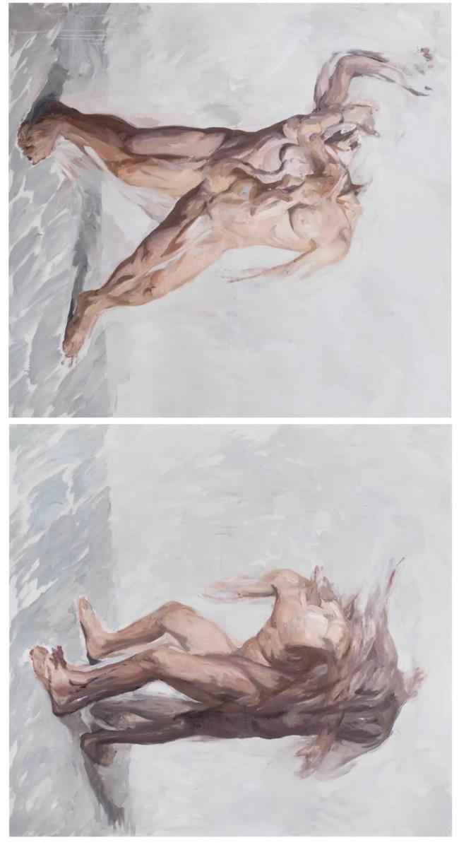 同前几年相比,司博闻的近作更为纯粹,或者换句话说,它们所承载的内容更单纯并贴近于现实本身,而其思考的深度并未缩减。画面中仍然是匿名的身体,但之前的那种如同神话隐喻或梦境般的宏大叙事被艺术家逐步拆解,被取而代之的是对某一动作的多维度呈现,他们分别来自艺术家经历的日常场景或浏览的新闻图片。他的创作更加贴近福柯笔下的异托邦世界,敞开一条通往存在本体的道路。故事性在他的近作中消失了,我们看到了如同生活潜影的图像依次出场,它们被艺术家主体的潜意识接收、打碎、转译,最终被移植到画面之上。