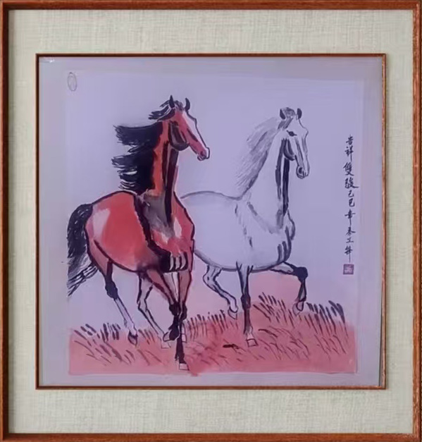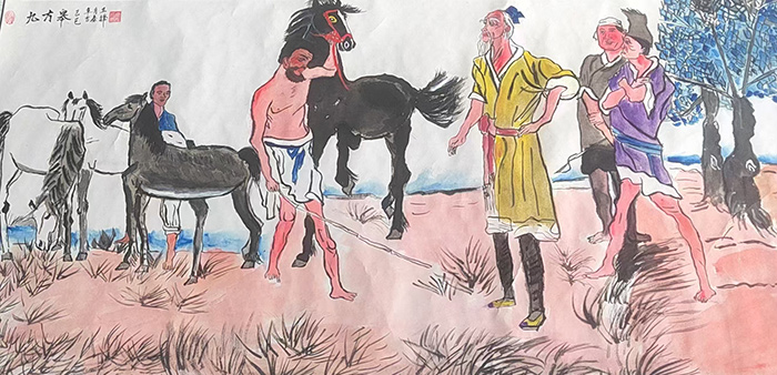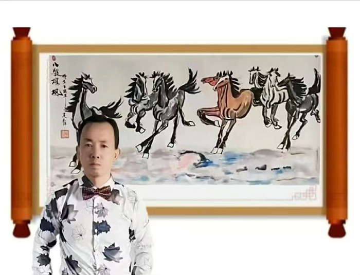 在创作上,秦卫锋展现出多方面的修养。其近期创作的国画《八骏雄风》,以洒脱的笔墨刻画骏马的勃勃英姿,展现了其在水墨动物画上的驾驭能力;作品《九方皋》则体现出对传统文化题材的深入理解与人文关怀。此外,他在诗歌方面的涉猎,如《桃花醉》、《蝶恋花》等,为其书画艺术增添了文学底蕴,呈现出“诗画相生”的传统意趣。