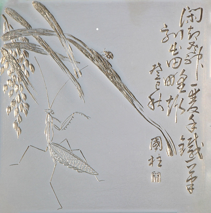 宋国柱的艺术之路,始于一段特殊的军旅生涯。上世纪70年代在北京服役期间,他有幸得到李苦禅、董寿平等书画大师的亲授,奠定了其深厚的书画功底与高雅的艺术品格。转业后,他将这份对传统书画的热爱,全部倾注于刻铜艺术之中。与普遍先描后刻或借助机械的现代工艺不同,宋国柱承袭了自清代“寅生”一脉相传的正宗技法——手持刻刀,不借任何底稿,直接在铜面上镌刻。这要求创作者必须具备即兴的书画创作能力、精湛的刀法以及强大的腕力,做到“刀至笔随”的艺术高度,其作品不仅形神俱妙,更能准确传递中国传统书画的笔墨意蕴,因而在艺术界独树一帜,广受学术界与收藏界的赞誉。