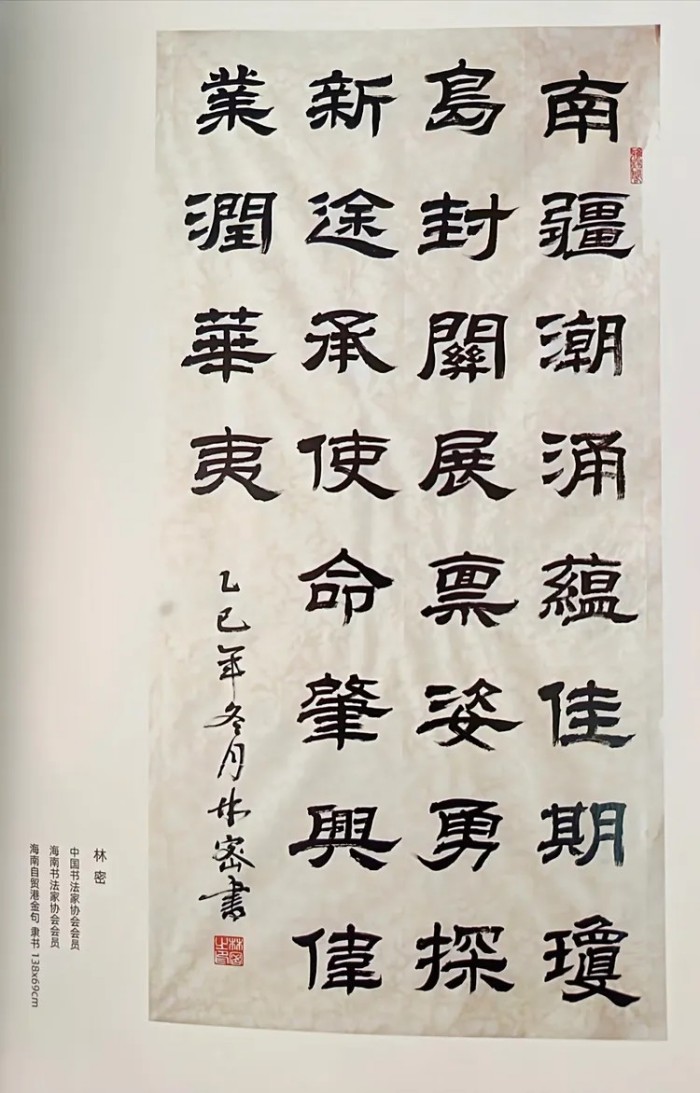 现为中国书法家协会会员,中国书画家协会理事,中国民间文艺家协会会员,海南省书法家协会理事,海南省民间文艺家协会理事,海南省文昌市民间文艺家协会副主席,海南省文昌市书法家协会秘书长。创新时代《世纪青少年书画印文大展赛》特聘评委兼指导老师,《世界华人艺术名家精品博览》专属研究员,《中国楷书选集》研究会会员,中国书画收藏家协会会员,墨香书法艺术研究院(海南分院)执教院长,海南“墨香书画院”文化交流协会会长,现在海南“墨香书画院”工作,兼任院长职务。目前,林密老师的书法作品在中国文化部艺术研究中心非物质文化遗产保护专业委员会,仍然保持一个稳定的市场流通价格,书法作品20000元(一平尺),其书法市值仍然还在一路飙升,被评选为中国当代具有收藏潜力价值的书法家。