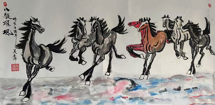 在创作上,秦卫锋展现出多方面的修养。其近期创作的国画《八骏雄风》,以洒脱的笔墨刻画骏马的勃勃英姿,展现了其在水墨动物画上的驾驭能力;作品《九方皋》则体现出对传统文化题材的深入理解与人文关怀。此外,他在诗歌方面的涉猎,如《桃花醉》、《蝶恋花》等,为其书画艺术增添了文学底蕴,呈现出“诗画相生”的传统意趣。