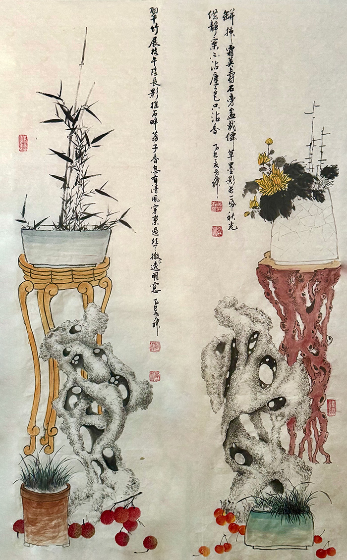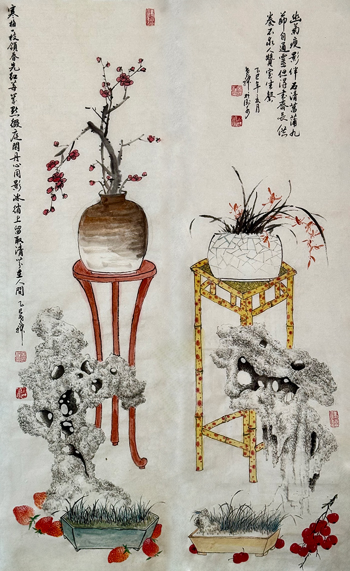 宋国柱的艺术之路,始于一段特殊的军旅生涯。上世纪70年代在北京服役期间,他有幸得到李苦禅、董寿平等书画大师的亲授,奠定了其深厚的书画功底与高雅的艺术品格。转业后,他将这份对传统书画的热爱,全部倾注于刻铜艺术之中。与普遍先描后刻或借助机械的现代工艺不同,宋国柱承袭了自清代“寅生”一脉相传的正宗技法——手持刻刀,不借任何底稿,直接在铜面上镌刻。这要求创作者必须具备即兴的书画创作能力、精湛的刀法以及强大的腕力,做到“刀至笔随”的艺术高度,其作品不仅形神俱妙,更能准确传递中国传统书画的笔墨意蕴,因而在艺术界独树一帜,广受学术界与收藏界的赞誉。