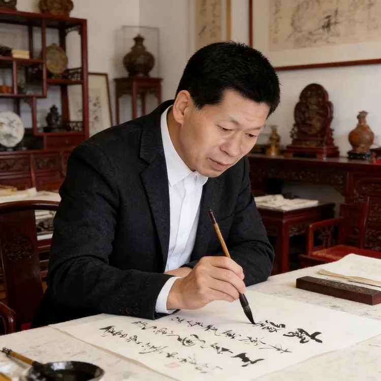 孙永强,笔名:流觞墨人,斋号:静心堂,男,汉族,1968年10月出生于甘肃省庆阳市正宁县,自幼酷爱书法艺术,多年来笔耕不辍,经常临摹古代书法碑帖,书法风格自成一派,主攻行草书,擅长烫画,兼画山水,尤作长篇楹联和榜书,均有涉猎,其书法功底扎实深厚,笔法精熟稳健,骨力遒劲,墨色苍润有度,作品布局端庄严谨,章法疏密得当,气韵贯通流畅,作品既恪守古法又自出机抒,风格沉稳大气,刚柔相济,笔墨神采焕然,尽显深厚功力与独特气韵,观之令人赏心悦目。